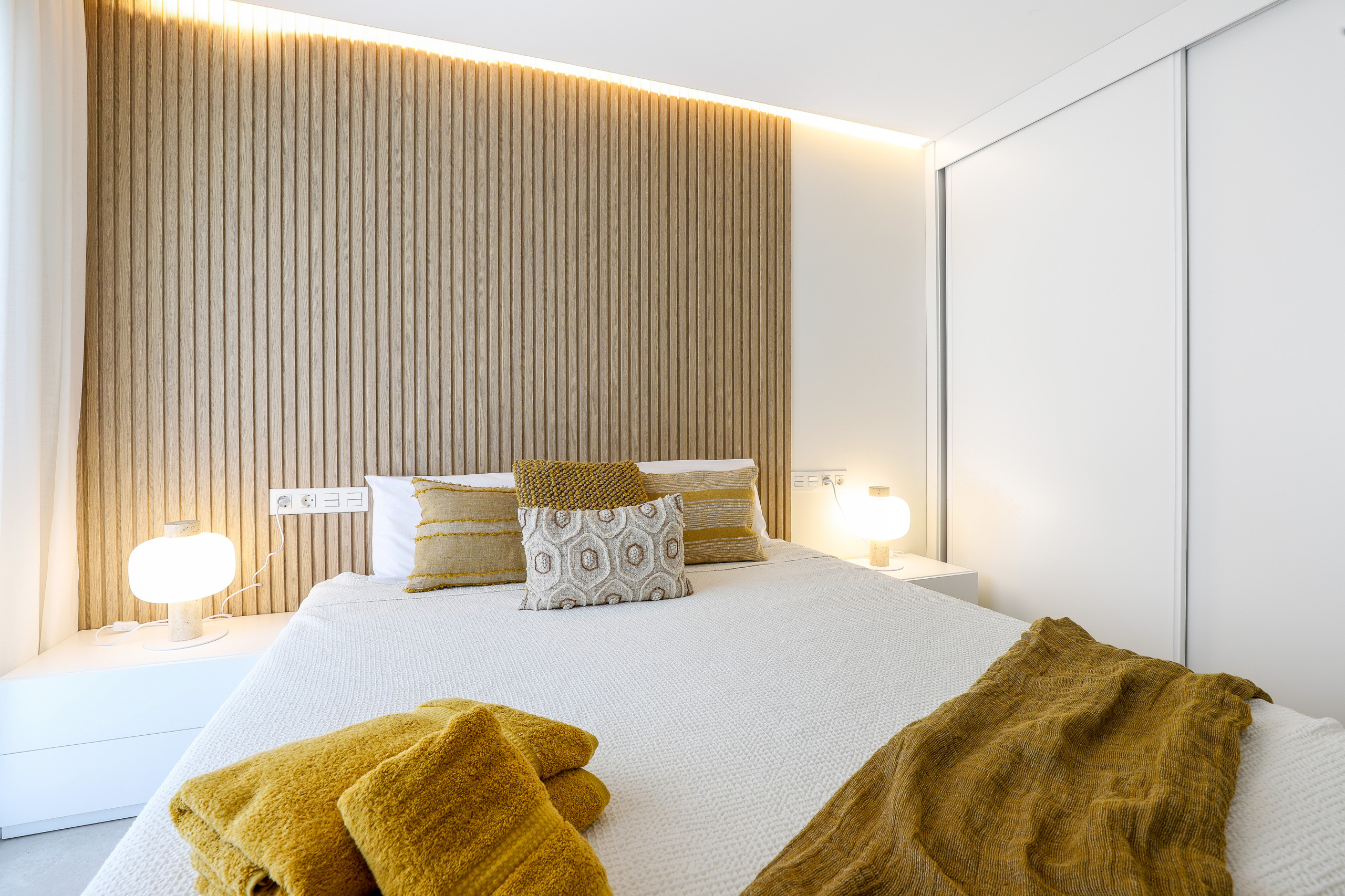 El amplio salón ofrece un sofá cómodo, televisión inteligente, mesa de comedor para 4 personas y un área de trabajo dedicada. La ventana del salón se abre completamente a un balcón orientado al sur con una zona de asientos y vistas al mar Mediterráneo y a la piscina comunitaria. El dormitorio principal tiene una cama de alta calidad, un hermoso baño con ducha y acceso a un balcón con vistas al mar. El segundo dormitorio tiene dos camas individuales y un cuarto de ducha contiguo. La fantástica cocina de planta abierta está completamente equipada para cocinar.