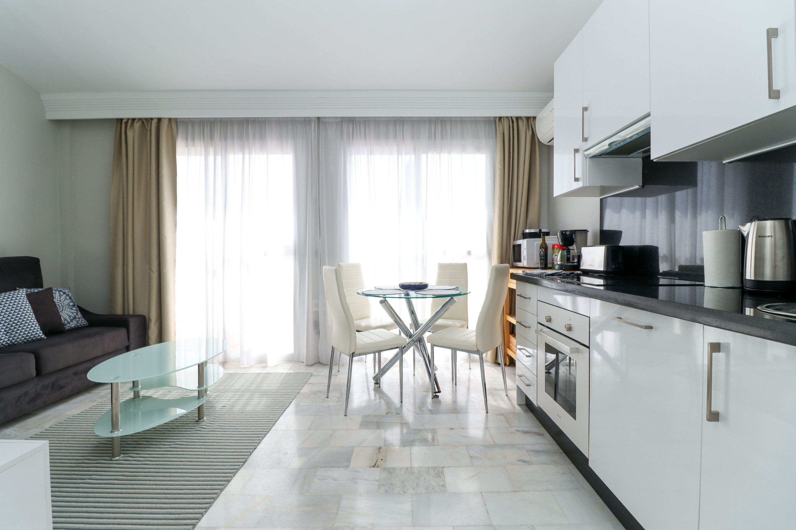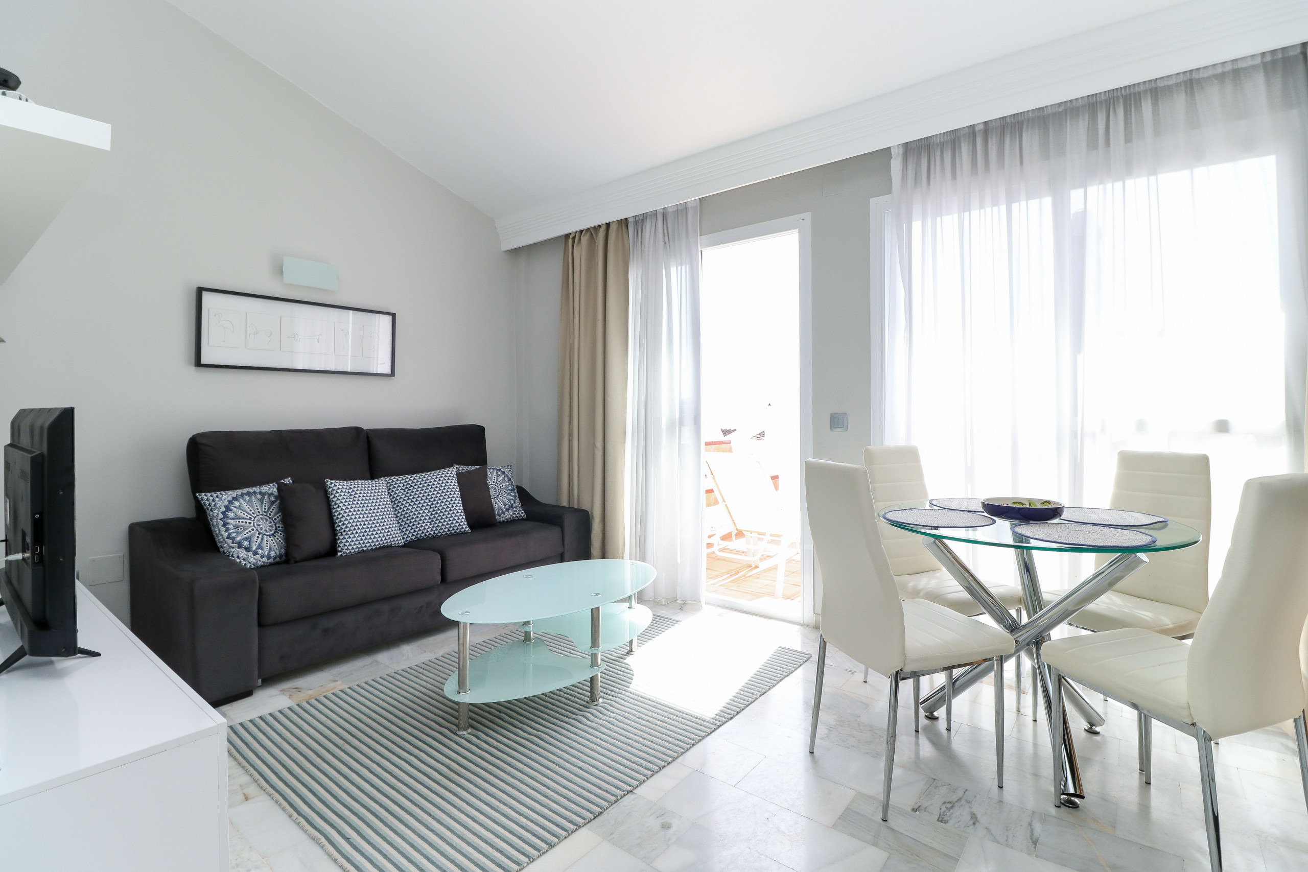 Estudio fantástico (40m2) en un complejo frente al mar con una gran terraza soleada y vistas al mar, con acceso directo a las mejores playas de arena de Elviria, al este de Marbella. El desarrollo seguro Romana Playa ofrece 5 piscinas exteriores (apertura estacional) y un parque infantil. La playa de arena es limpia, ideal para familias y una de las mejores de la zona. La ubicación es muy animada y a poca distancia a pie de varios restaurantes, bares, supermercados y otros servicios. El centro de Marbella está a 15 minutos en coche.