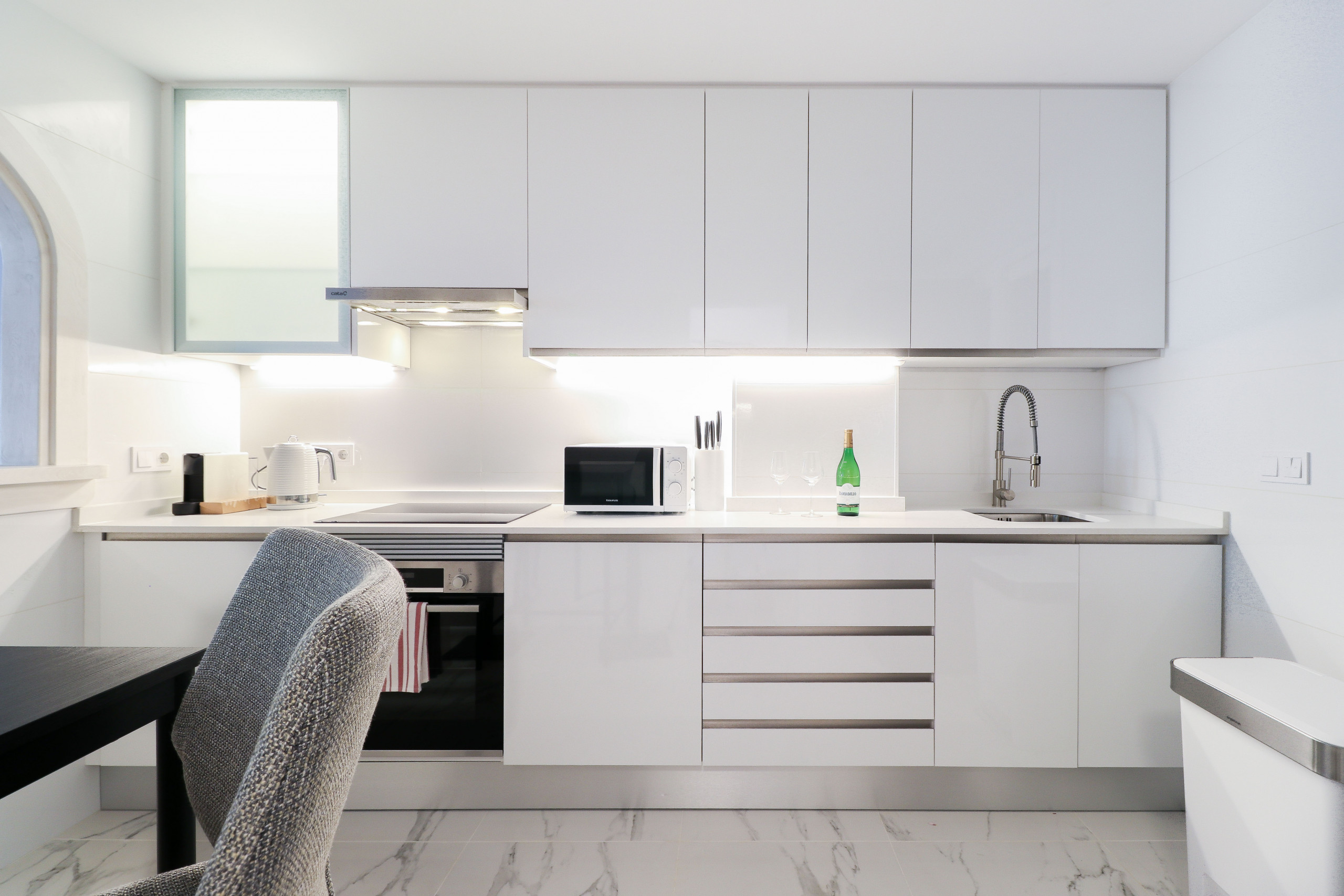 Apartamento-estudio luminoso y moderno completamente reformado en 2020. Cuenta con una sala de estar con cama king size, cómodo sofá-cama, cocina de planta abierta (¡sin lavavajillas!) y un cuarto de baño con ducha. Terraza orientada al sur (20m2) para disfrutar del sol y unas vistas fantásticas durante todo el día.