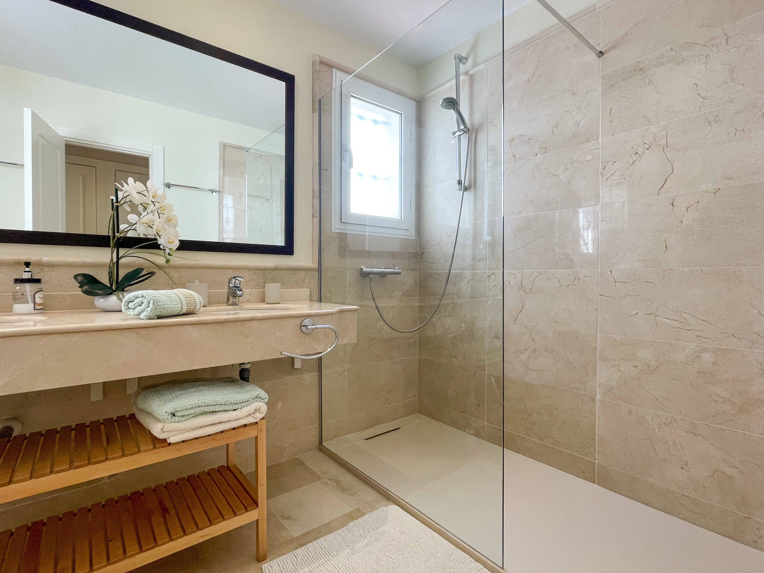 Amplio apartamento de planta baja (120m2) que ocupa una buena posición con terraza orientada al oeste y acceso directo a los jardines comunitarios y la zona de piscina. Amplia zona de estar/comedor con cómodos sofás y smart TV que conduce a una terraza completamente cubierta para disfrutar del sol de la tarde y del entorno tranquilo. La terraza cuenta con una zona de asientos cómoda y una mesa para cenas al aire libre. La cocina está totalmente equipada con una sala de servicio independiente. Dormitorio principal con cama de matrimonio super king size (180x200), ducha y mucho espacio de armario. Segundo dormitorio con cuarto de ducha contiguo tiene dos camas individuales y acceso a un balcón tipo Juliet. Las camas individuales pueden sustituirse por un colchón de matrimonio previa solicitud. Nuevo sistema de aire acondicionado de alta calidad (calor/frío) con control integrado de Air-Zone, Wi-Fi rápido, smart TV grande y parking subterráneo.