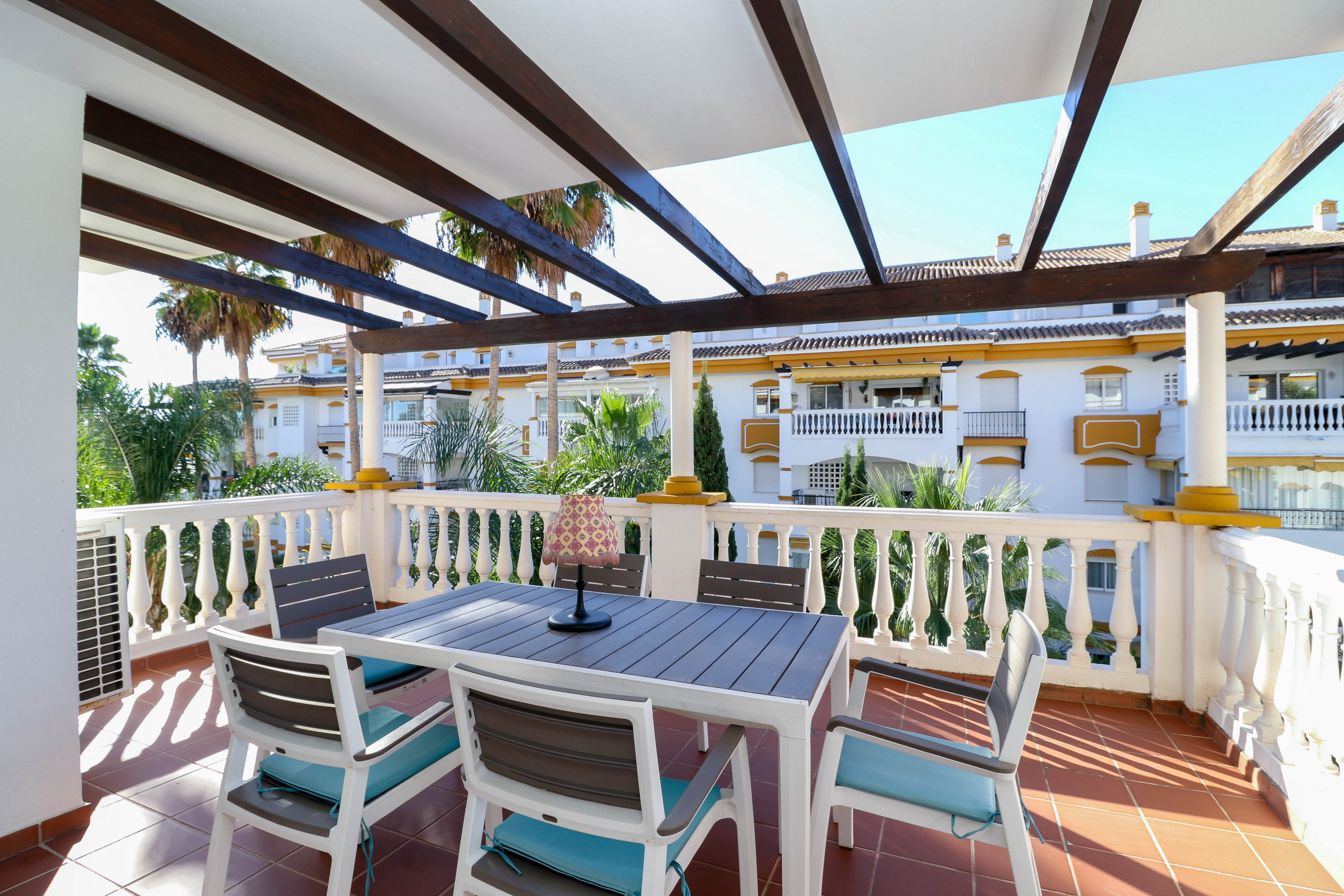 Comfortable apartment with terrace perfectly located just 15 minutes easy walk to famous Puerto Banus, the beaches, promenade, endless shopping, restaurants and all amenities you wish for! Popular urbanization Dama de Noche offers 2 large swimming pool areas, restaurant onsite, paddle courts, kids playground and 24-hour security. Lovely apartment fully air conditioning, Wi-Fi, Smart TV, large covered terrace with garden view, south-west facing. Parking space in the garage with lift.