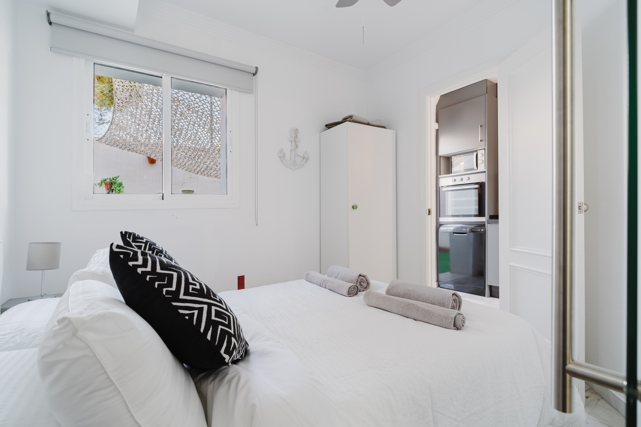 Наверху главная спальня оснащена двумя односпальными кроватями (90 x 190 см), сдвинутыми вместе, образуя кровать king-size (180 x 190 см), кондиционером, зеркальными шкафами, душем в номере и выходом на солнечную террасу с шезлонгами, идеально подходящую для отдыха на испанском солнце.